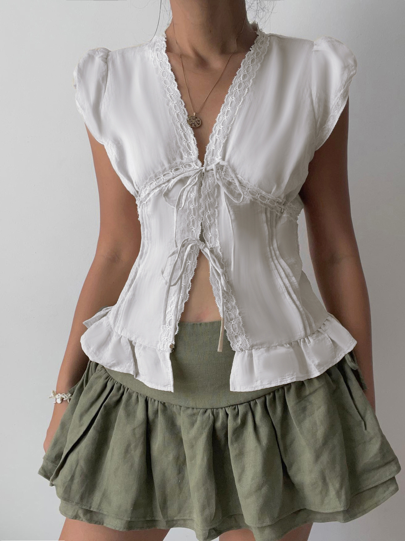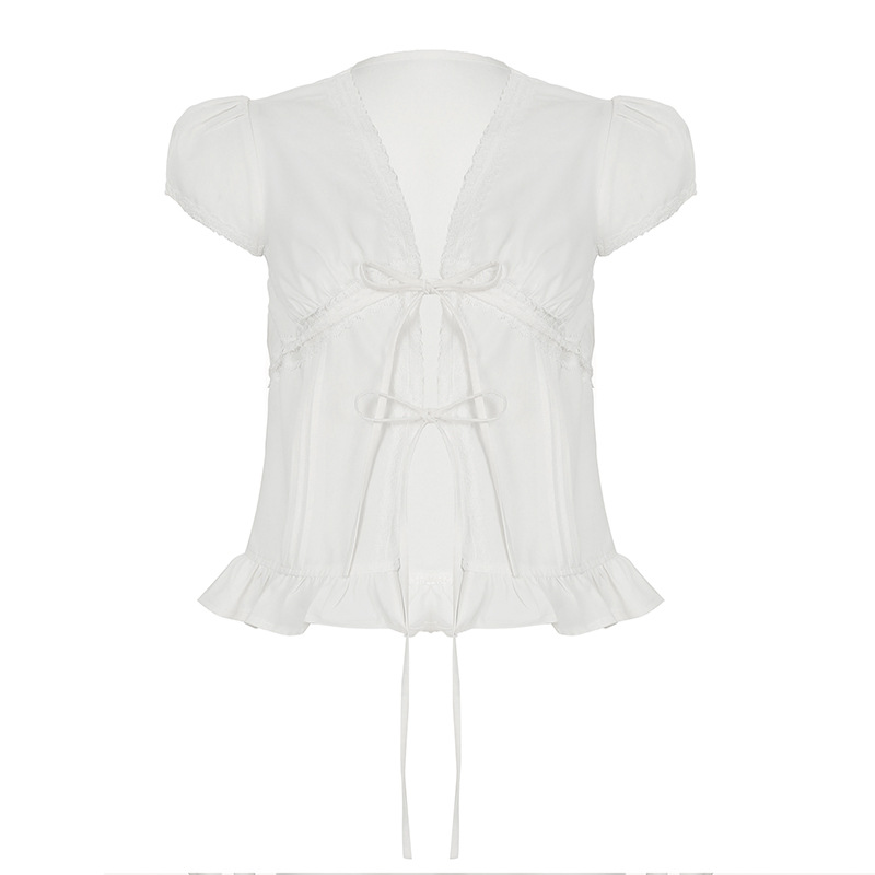 French Girl Lace Spliced Folded Bubble Sleeve With Shirt V-Neck Repair Lotus Leaf Blouse Woman HZ0108