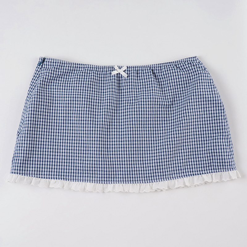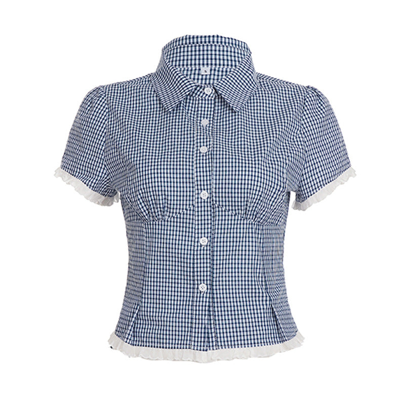 Lattice Lace Splicing Edge V-Neck Shirt Blue Vintage Hottie Waist Thin Cardigan Top Woman HZ0107