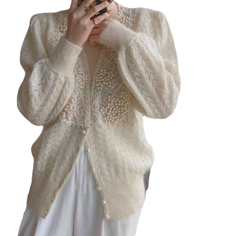 Pearl Inlaid Cardigan Sweater Jacket Woman In The Spring Of 2025 New Temperament Famous Small Fragrant Hollow Loose Top HZ0108