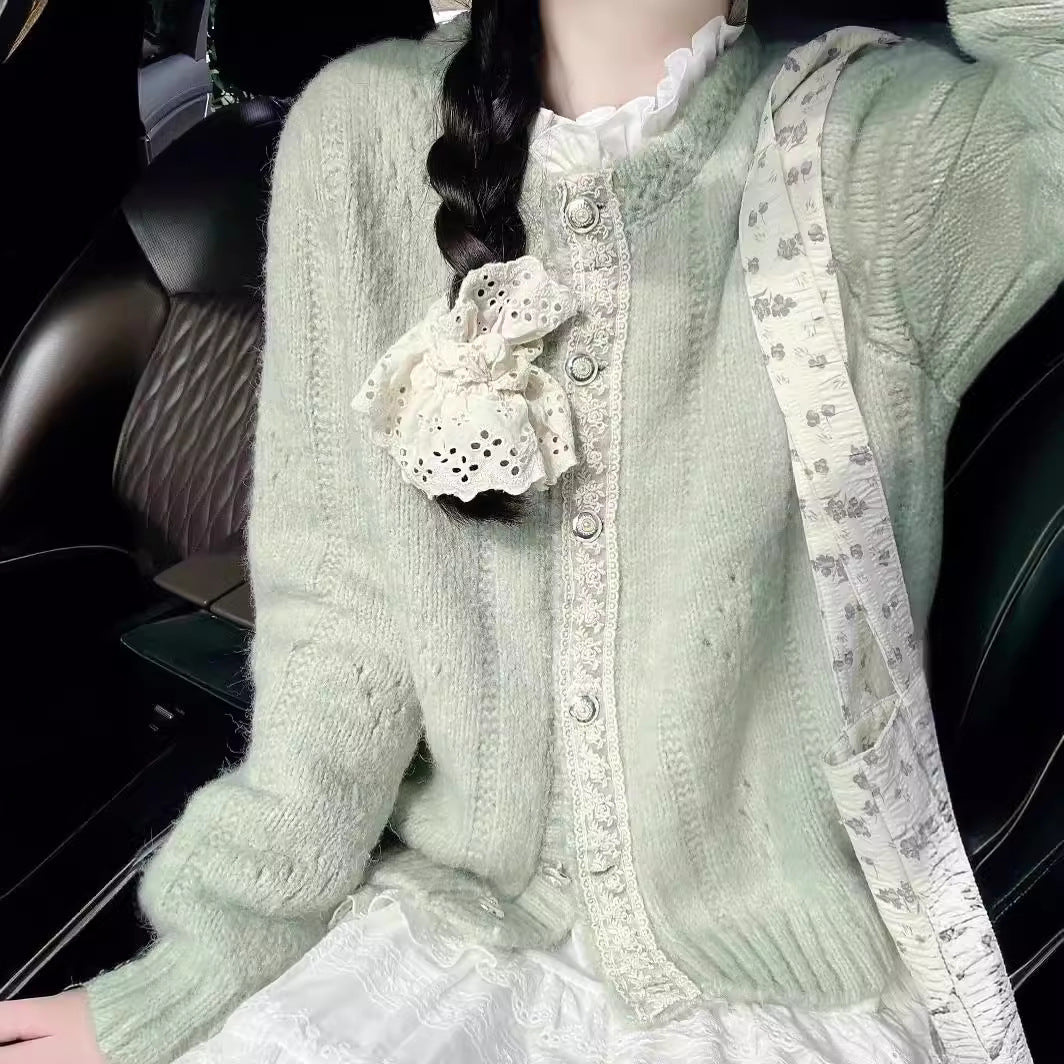 Soft Glutinous Milk Green Lace Round Knitted Jersey Women Autumn New Lazy Windy Loose Sweater Women's Cardigan Coat Women HZ0108