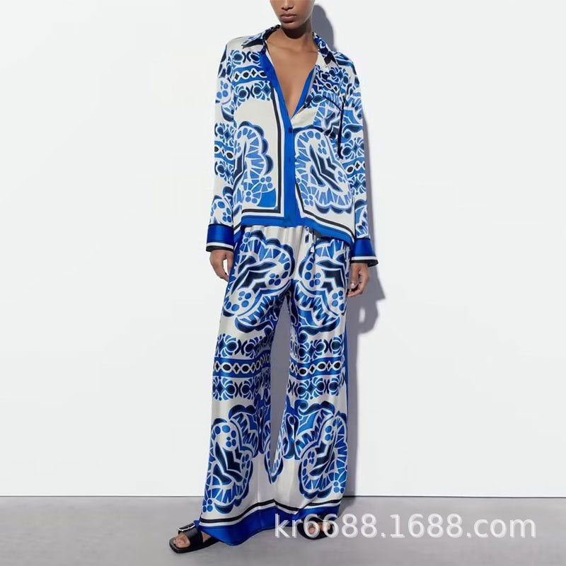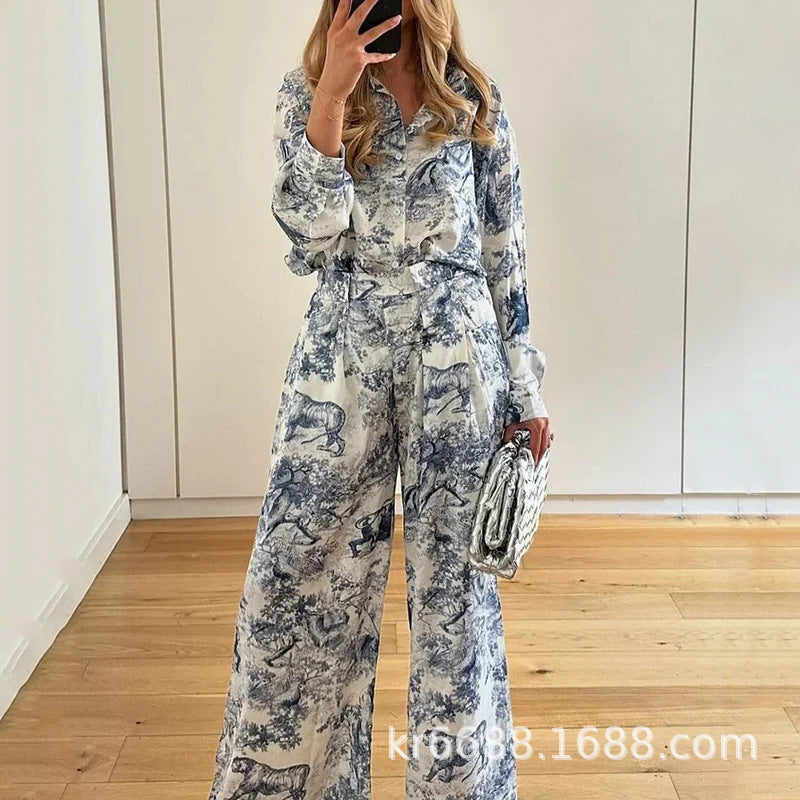 Spring Women's Dress 2025 Temperament New Casual Print V-Neck Shirt Broad Leg Pants Women's Suit HZ0108