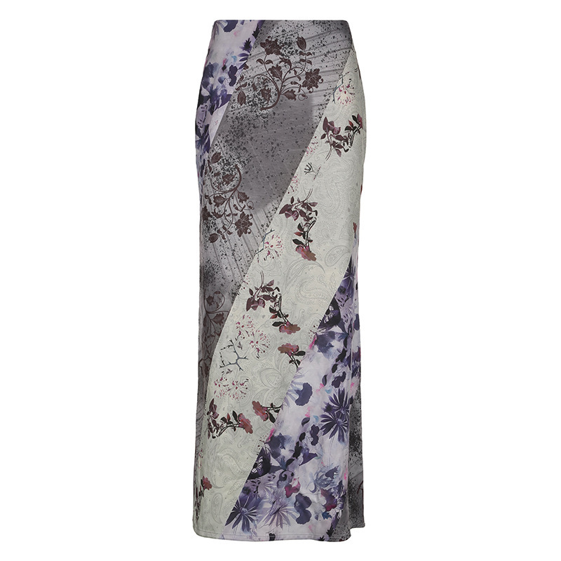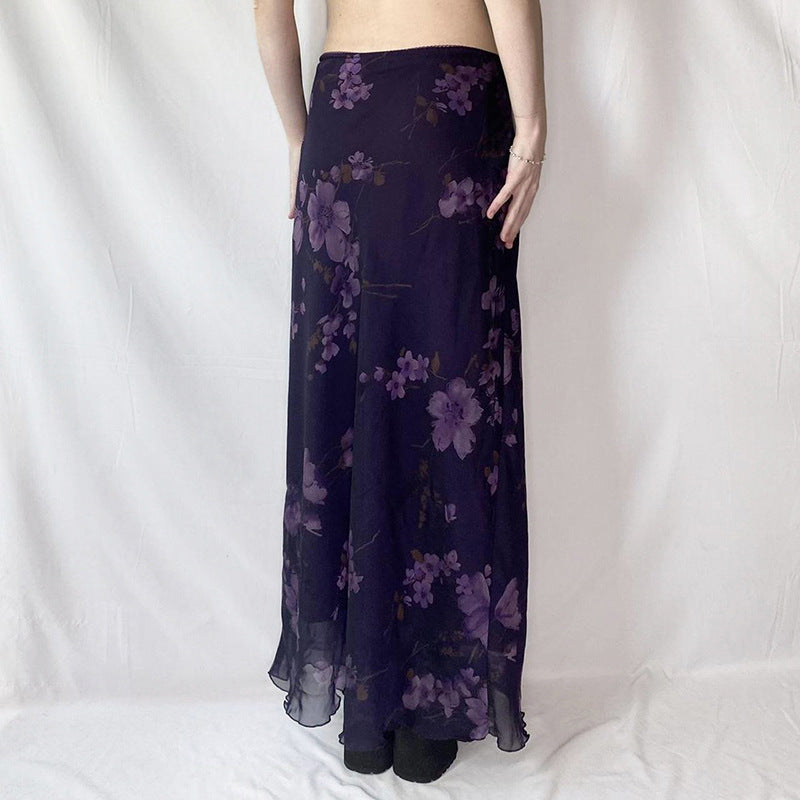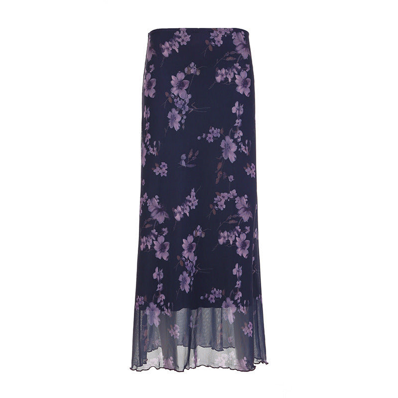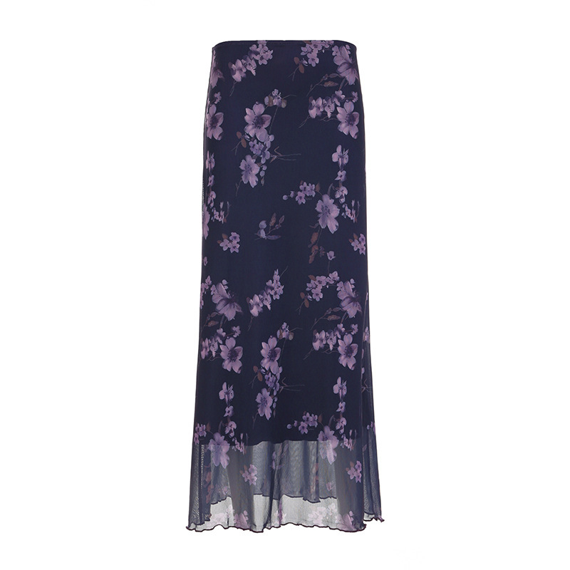 2025 Autumn And Winter Women's Clothing In Hot Girls Mysterious Purple Plant Print Mesh Splicing Thin High Waist Half-Dressed HZ0107