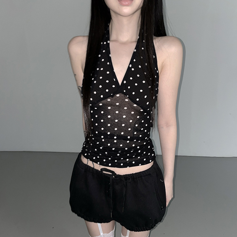 2025 New Black Wave Point Bare Back V-Neck Hanging Neck Top Female Design Temperament Waist Ocean Vest HZ0107