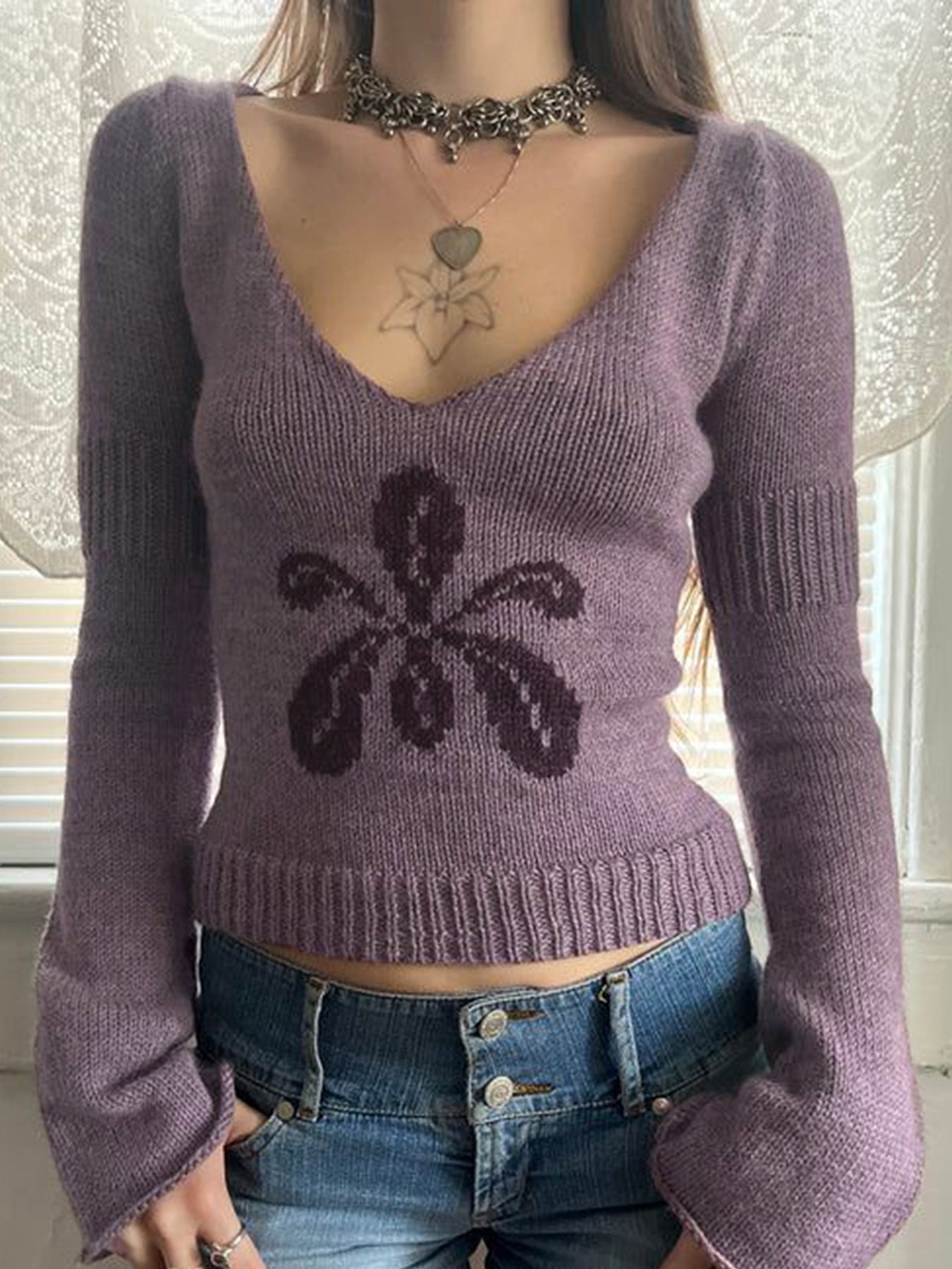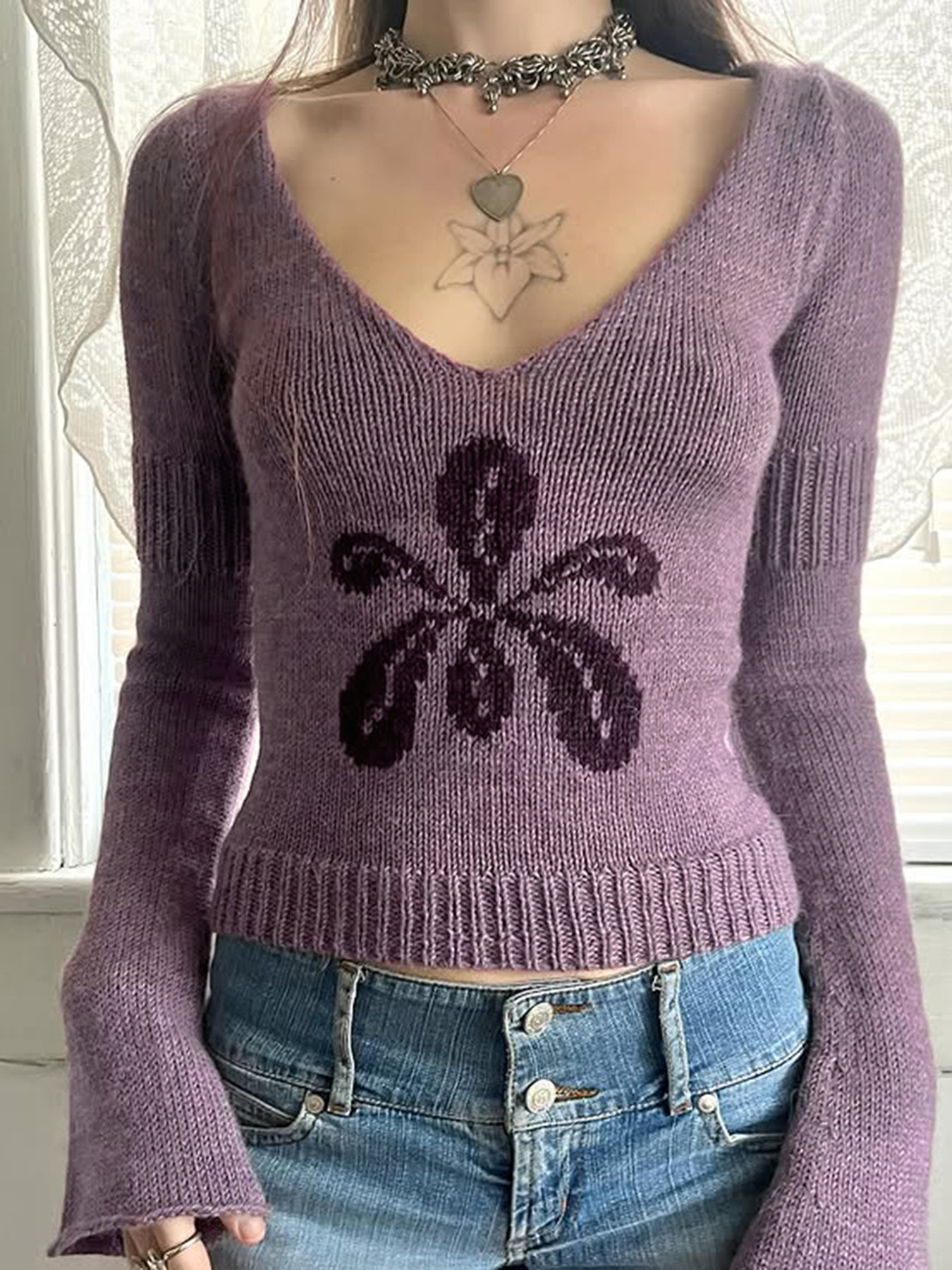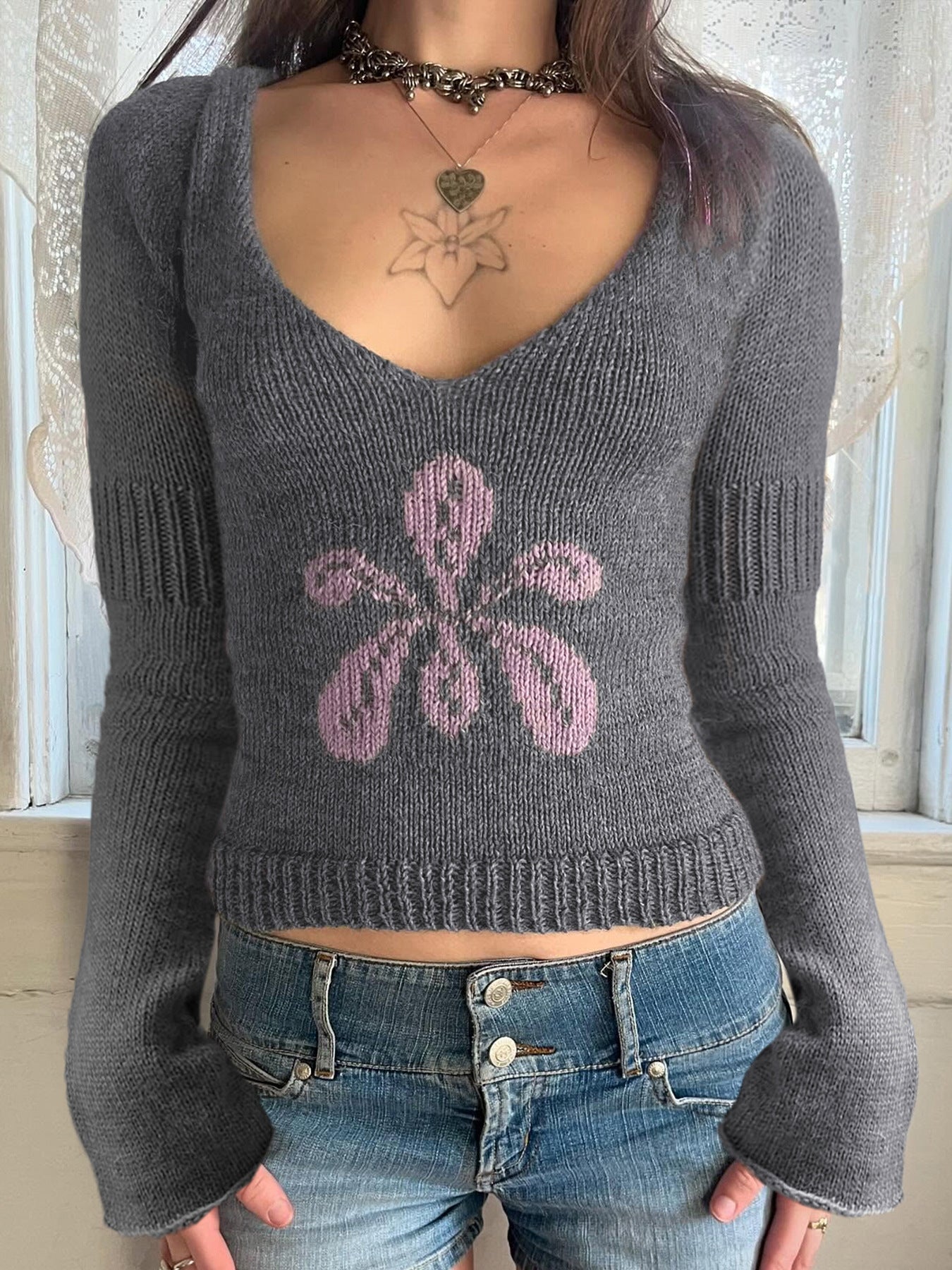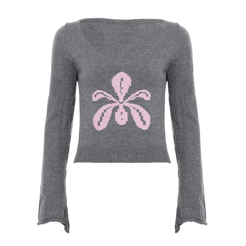 V-Neck Flower Repair Lazi Long-Sleeved Round-Neck Knitted Shirt Comfortable Foundation Of A Short-Edie Flower Sweater HZ0108