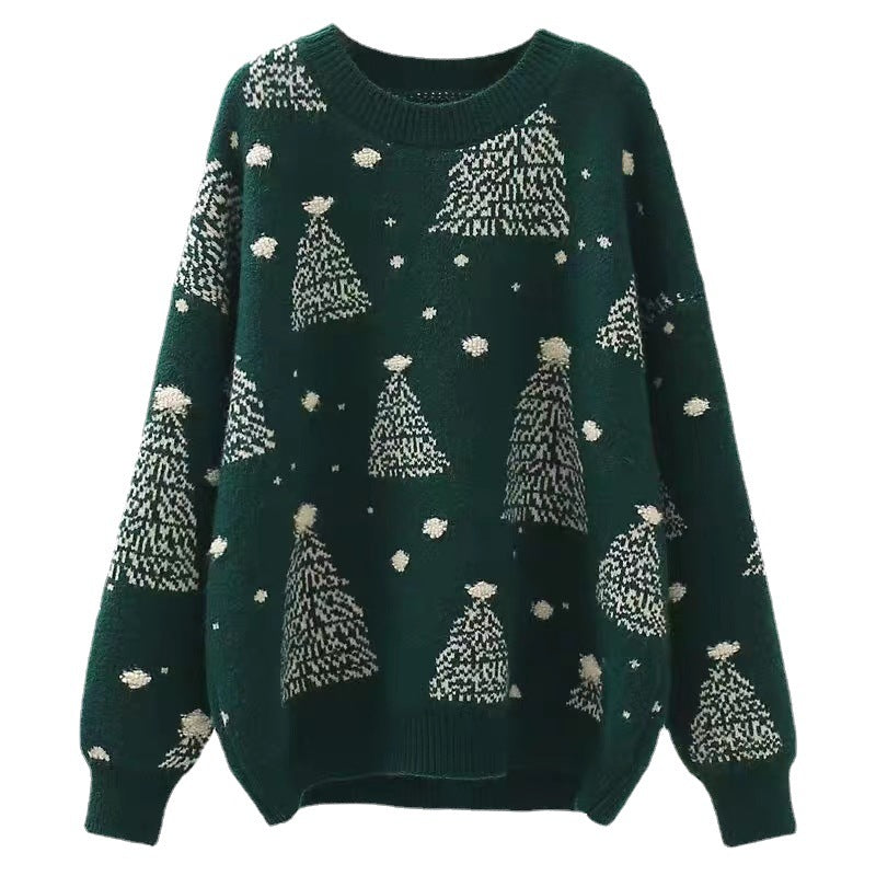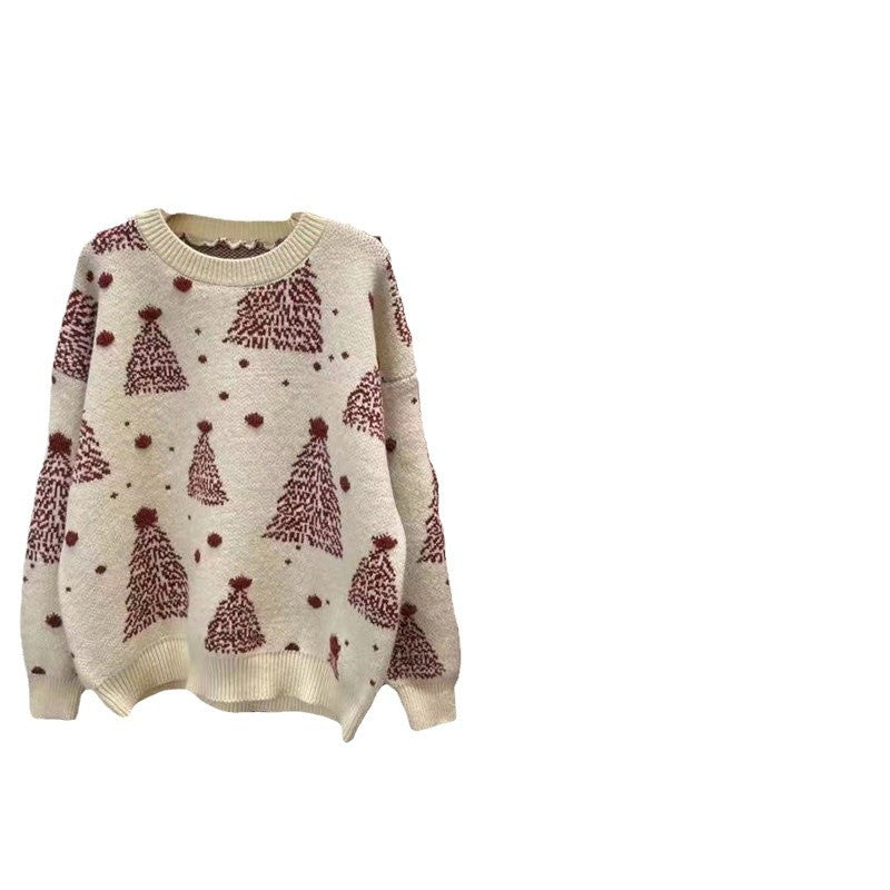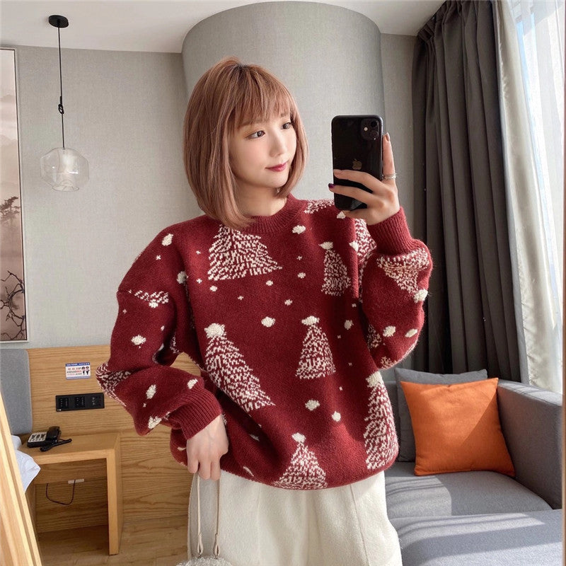 2025 Autumn And Winter New Korean Version Of The Round Collar Collar Loose Loose Lazy Wind Christmas Design Feeling Knitted Shirt Top Woman HZ0108