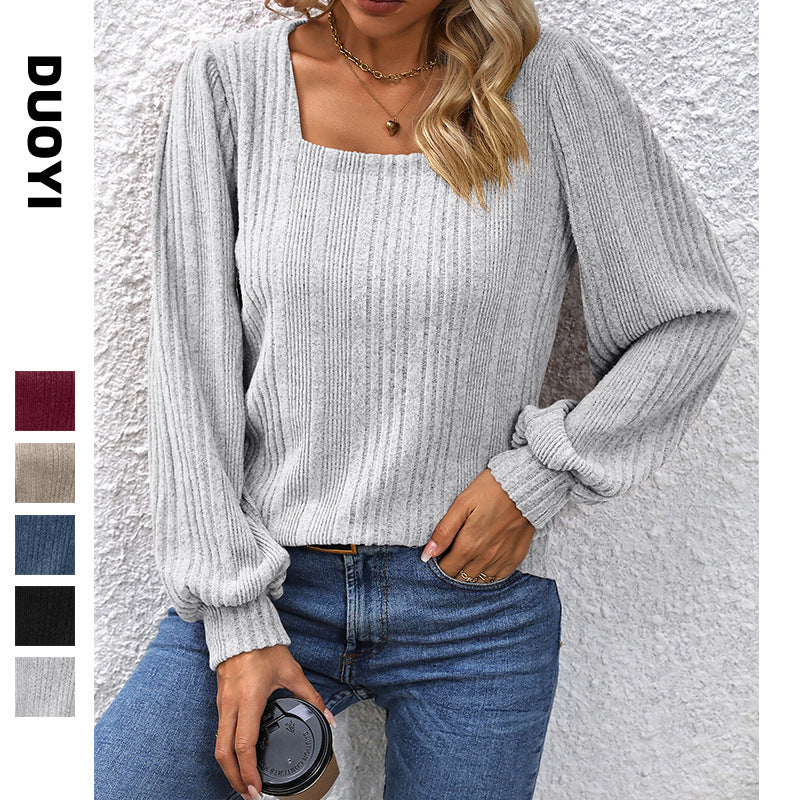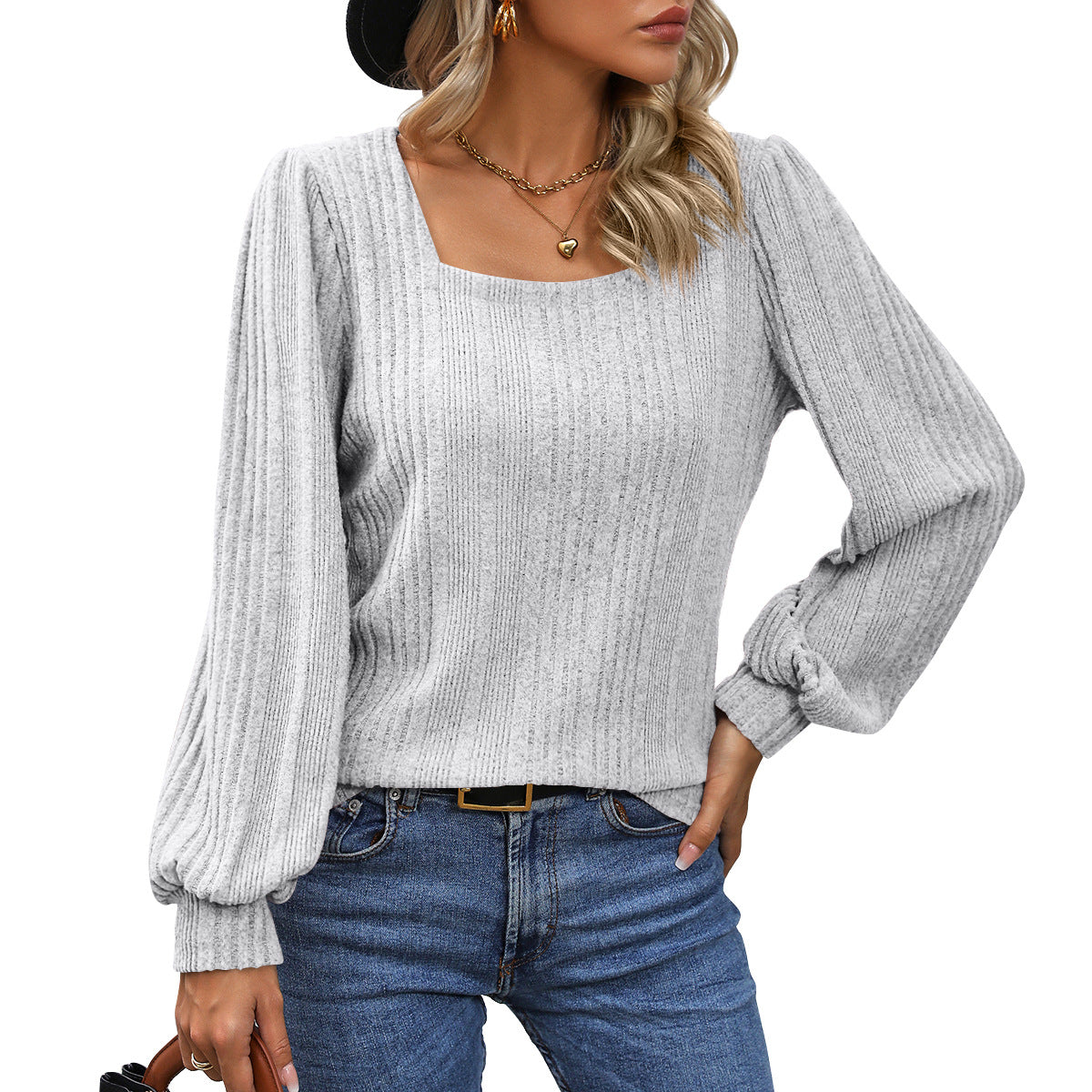 2025 Autumn And Winter New Lady Pit Strips Grinding Square Collar Fashion Lantern Sleeve Long Sleeve Top HZ0108
