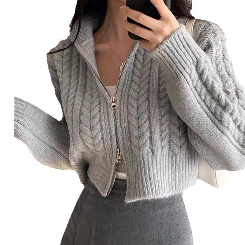 2025 Autumn And Winter Women's Version Of The Korean Version Of The Retro Temperament Students Double Zipper Solid Color Sesame Sweater Coat Women's Knitted Open Shirt HZ0108