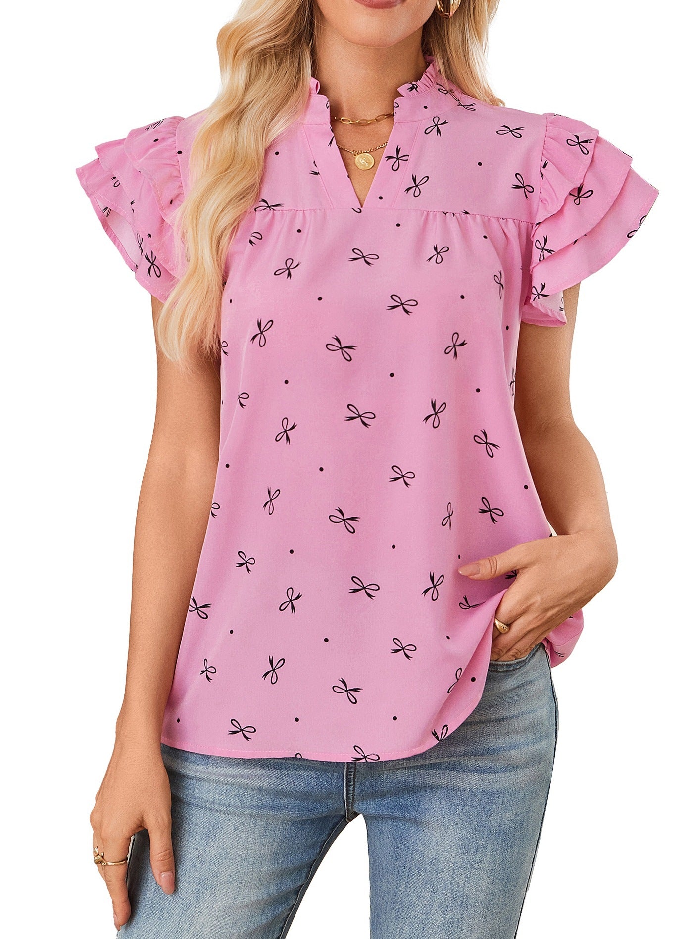 2025 Explosion Lady V-Neck Multi-Layer Lotus Leaf Sleeve Sweet Chiffon Top HZ0108