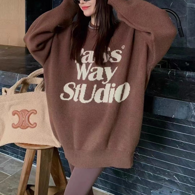 2025 Fashion Temperament Retro Spring And Autumn Wearing Knitted Shirt Letters Hit The Color Lazy Sweater Women's Top HZ0108