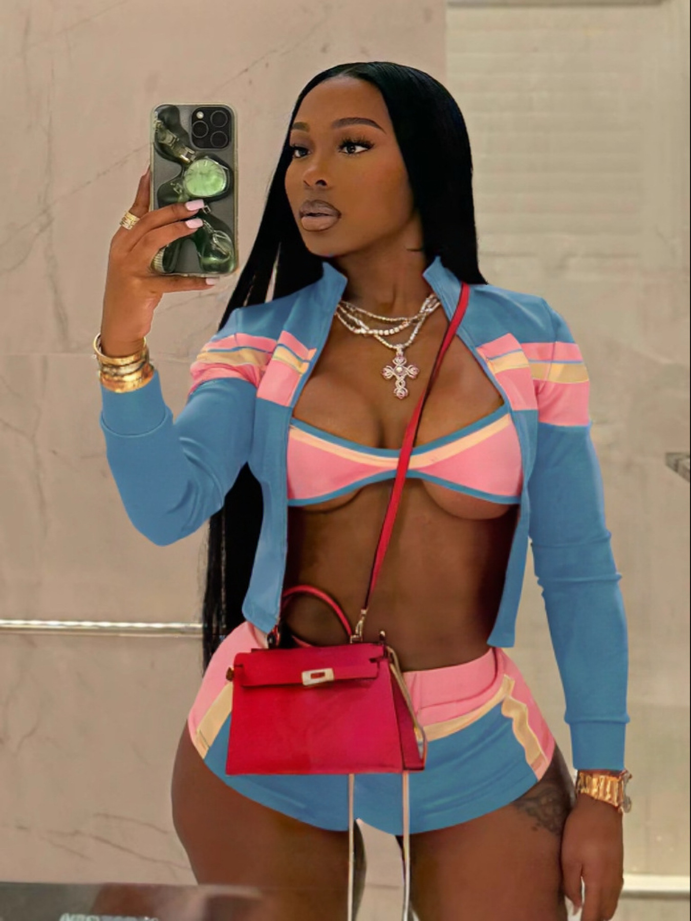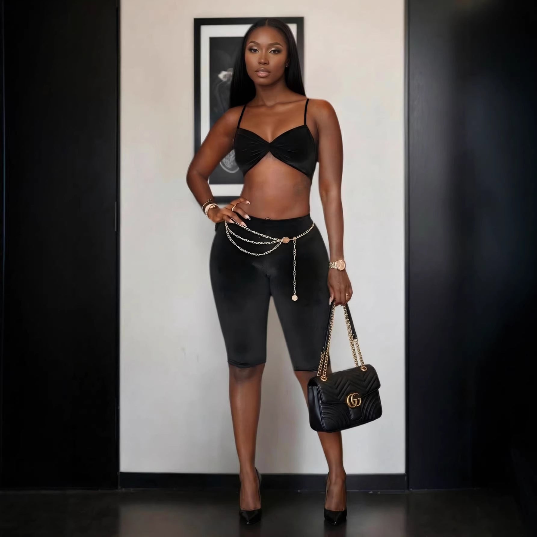 2025 Fashion Women's Clothing Collage Long Sleeves One-Word Wrapped Braided Trousers Three-Piece Set HZ0108