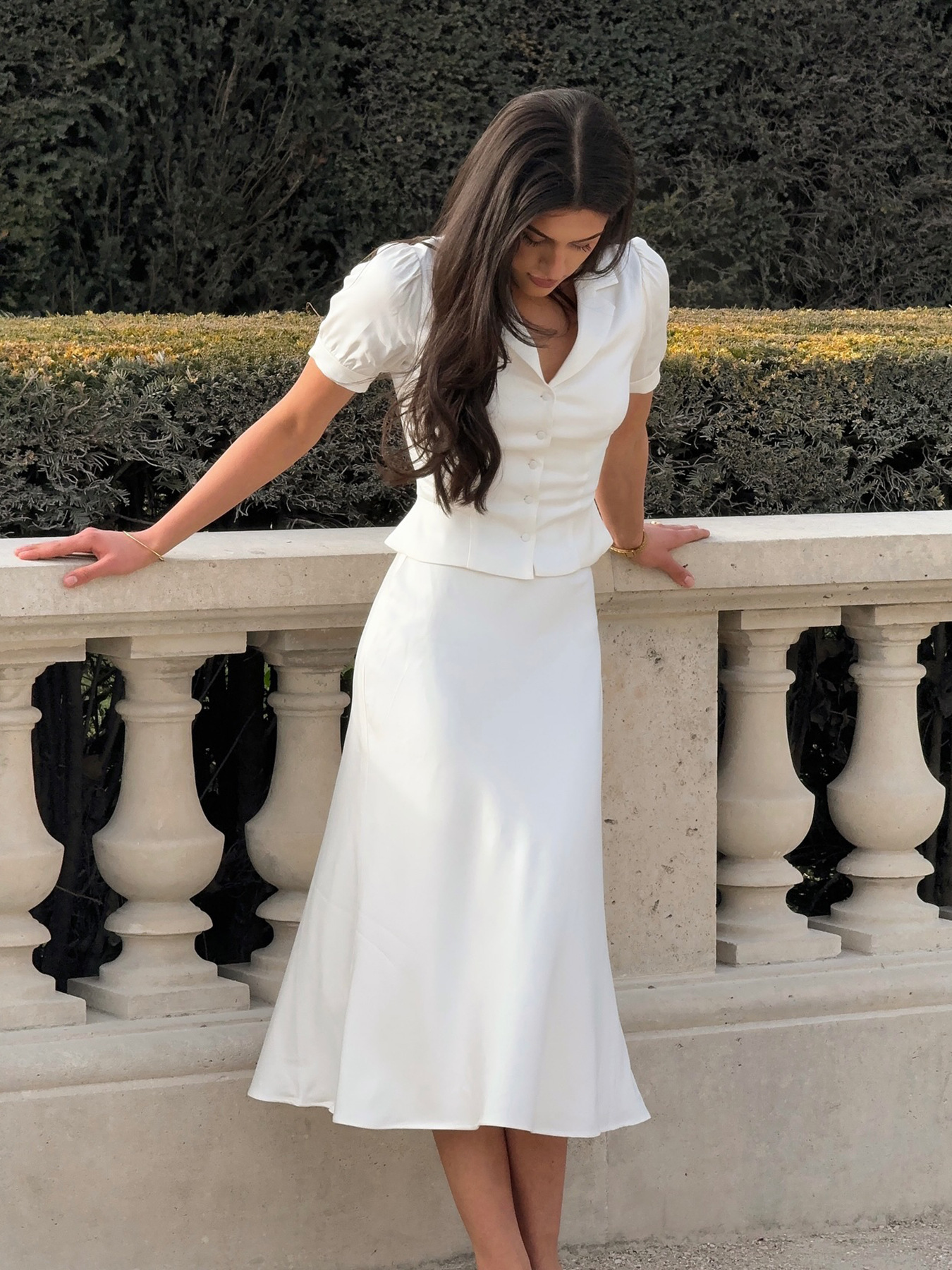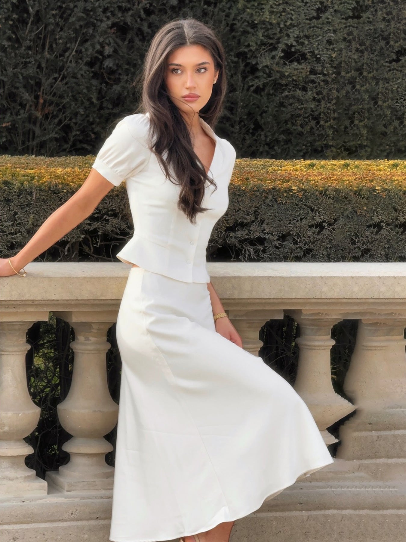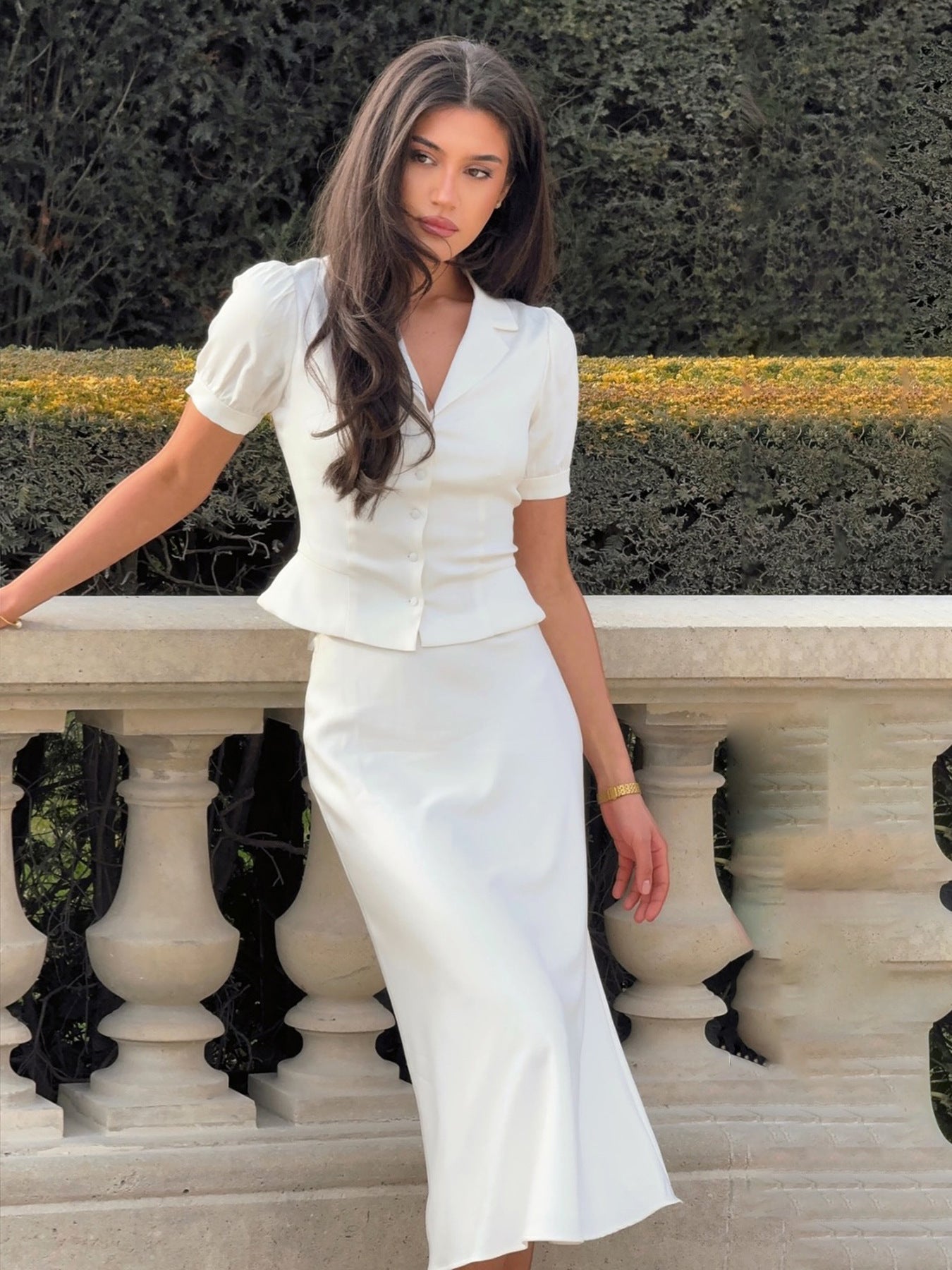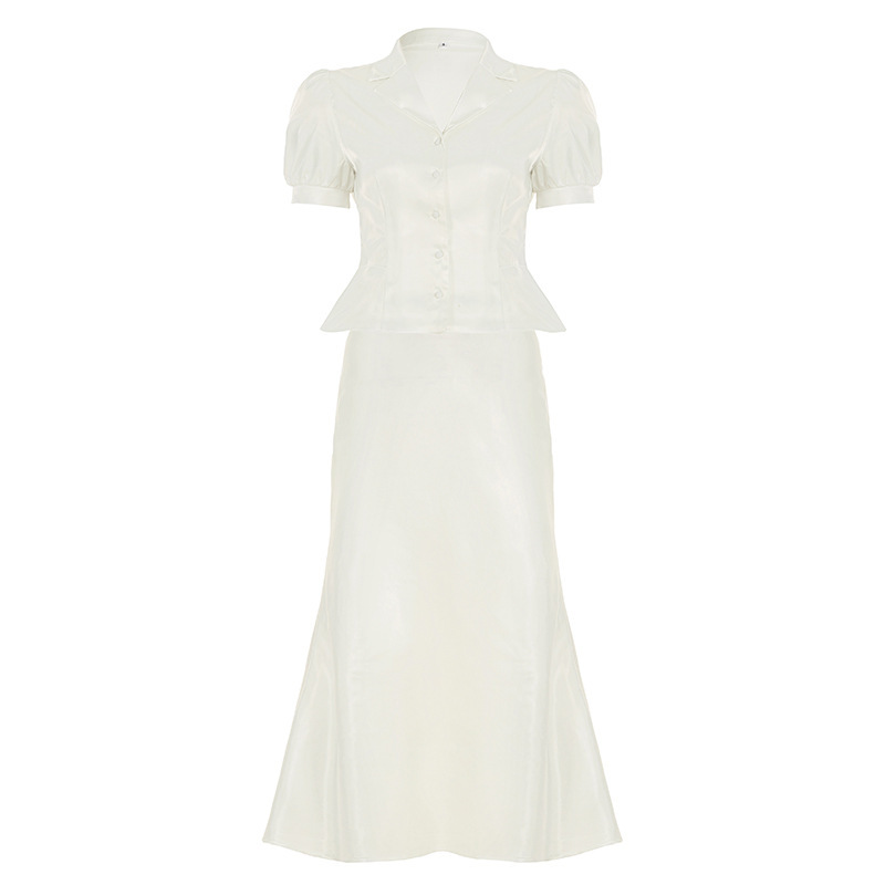 French Elegance Of Pure Color Bubble Sleeve Clip Buckle Clasp Blouse A Word Swing Fishtail Dress Lady Fashion Set HZ0108