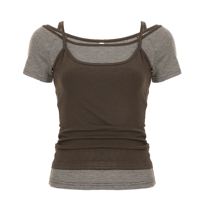 Pure Hot Babes Hit The Color Repair Casual Two-Piece Blouse Summer Round Neck T-Shirt Folded Small Sling Girl HZ0107