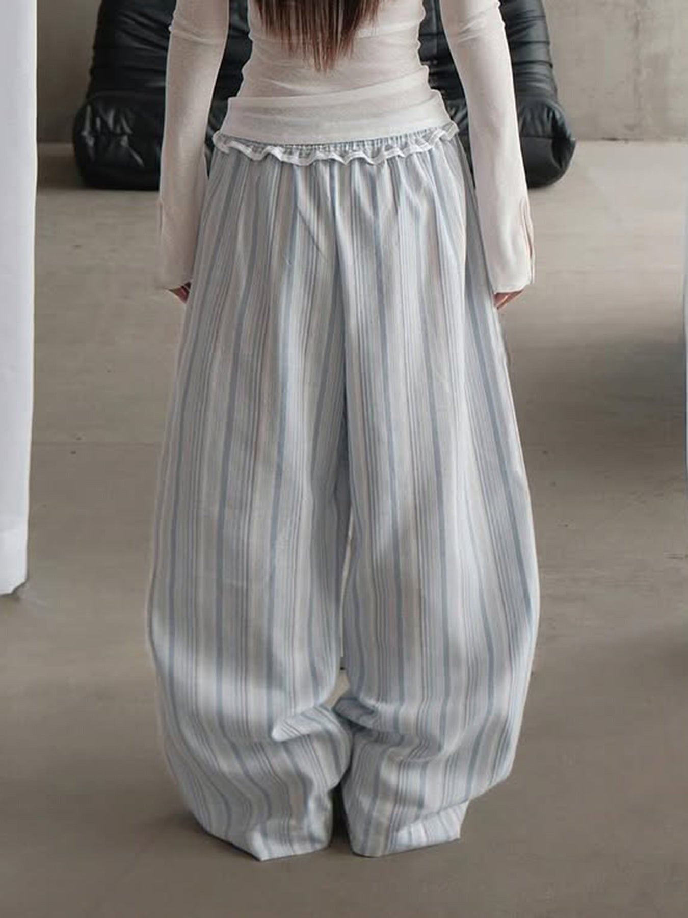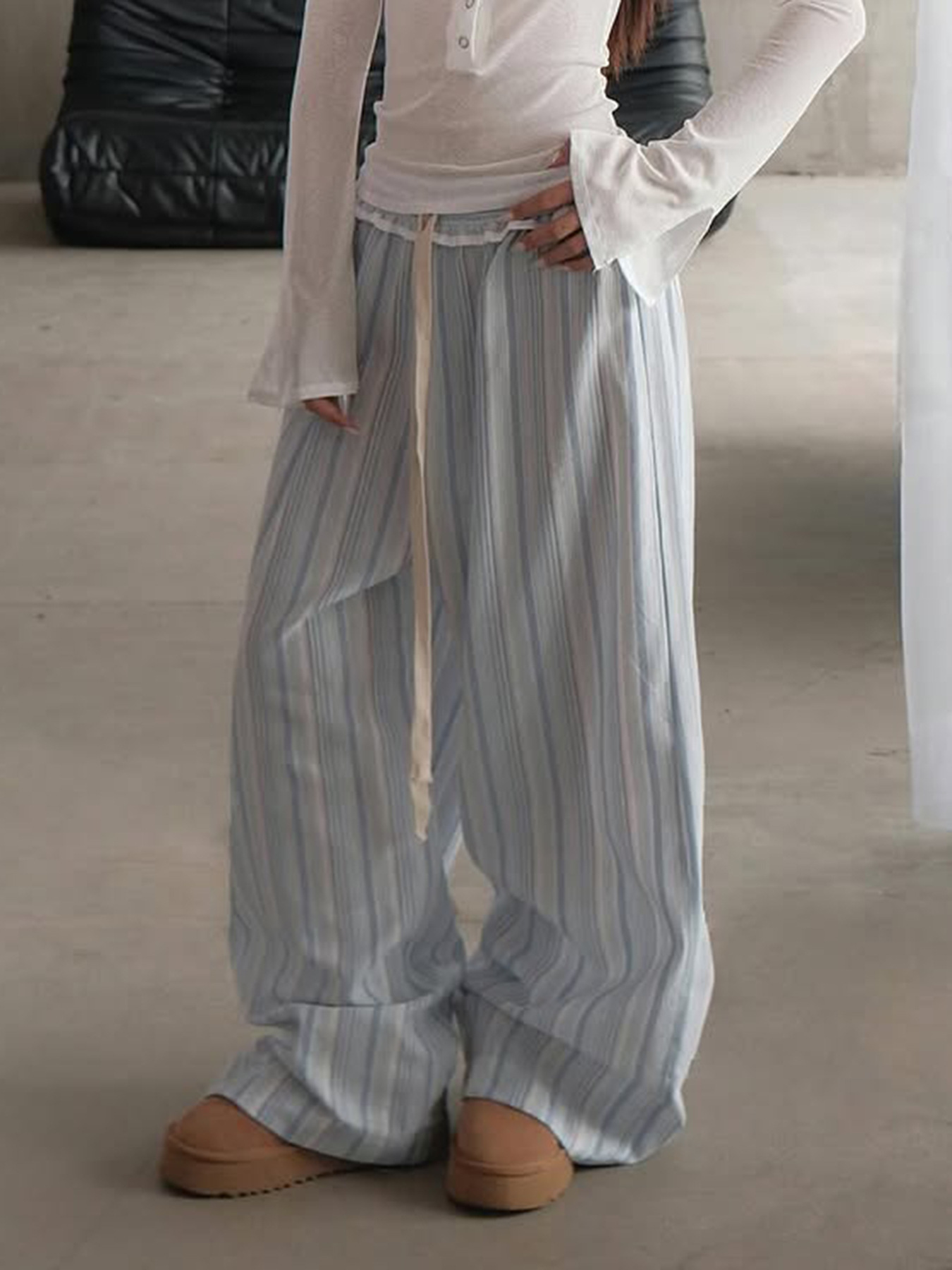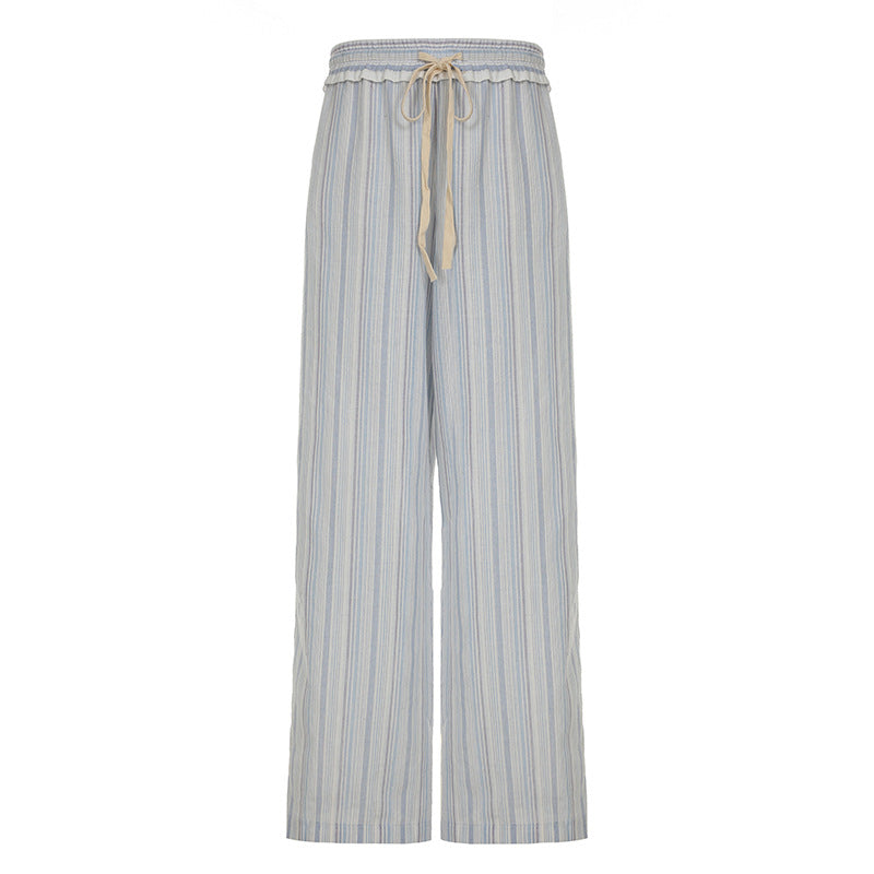 Sweet And Spicy Fresh Wind Striped Wood Ear Tie With Wide Leg Pants Fashion Splicing Comfort And Loose Casual Trousers HZ0108