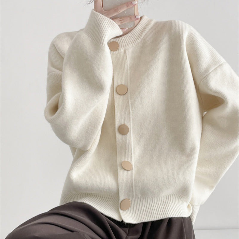 Women's Autumn And Winter Design Sense Single Buckle Solid Color Knitted Cardigan Sweater Jacket Lazy Wind Loose Round Neck HZ0108
